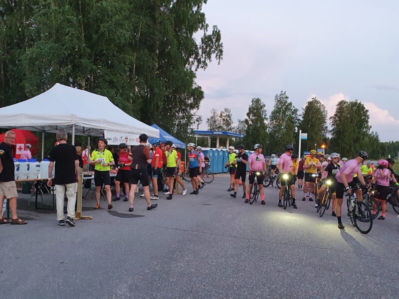 SAIMAA CYCLE TOUR 2025 11.-12.7. Latulaiset talkoissa illan ja yön aikana Suomenniemen, Mikkelin ja Anttolan huoltopisteillä. Yleisöä toivotaan reitin varrelle kannustamaan.